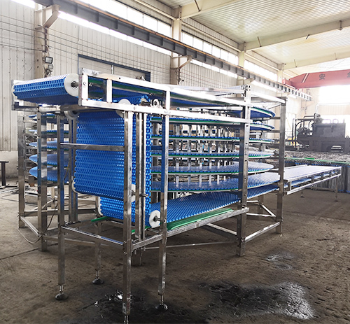 食品回盘线输送机结构简单、便于维护;能耗较小,使用成本低。主要在食品、饮料、水果加工、灌装、易拉罐、清洗、PET吹瓶、五金零部件生产中应用的较多;链板:POM、PVC、不锈钢304、306#材质;整机加工:直线、转弯单排、多排、隔板提升式。